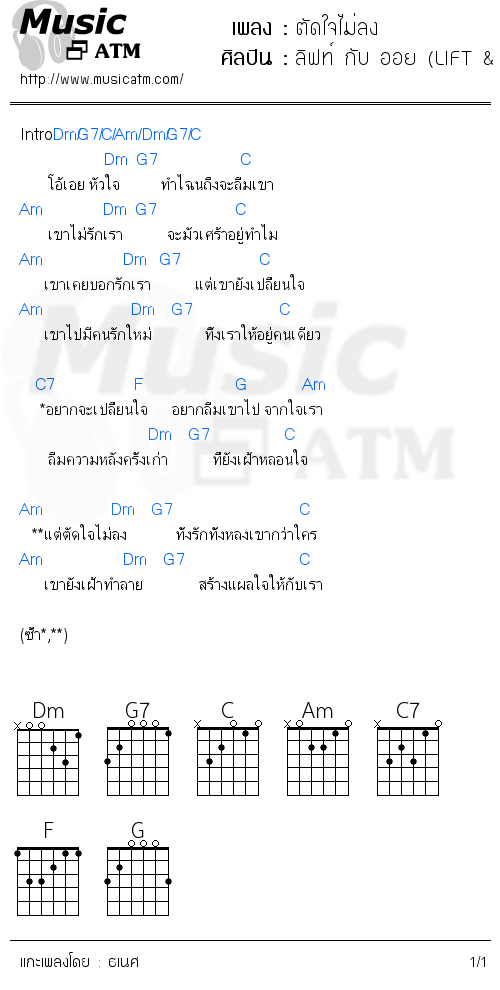 คอร์ด กีต้าร์ คอร์ด อูคูเลเล่ แทป guitar ฉันยังลงใจให้เธอ (ยืนต่อเพื่อท้อใจ) โอ้ยเจ็บไปทั้งหัวใจทำไมยังทน เริ่มใหม่อีกกี่หนนะคนใจร้าย ปวดไปทั้งหัวใจแทบเจียนตาย คอร์ดเพลง ลงใจ the toys เนื้อเพลง คอร์ดกีตาร์ อัลบั้ม รวมเพลง cover. แหล่งรวมคอร์ดเพลง, เนื้อเพลง, คอร์ดกีต้าร์, คอร์ดอูคูเลเล่ guitar tab guitar chord ukulele lyric สำหรับนักดนตรีมือใหม่ และ นักดนตรีทั่วๆไป คอร์ดลงใจ cmaj7 gm fmaj7 fm ปลอบใจตัวเอง ว่าฉันมาไกลเกินย้อนไป เหนื่อยแทบไม่ไหว และน้ำตายังไหลนอง cmaj7 gm fmaj7 fm สิ่งที่ประคอง กลับค่อยๆไกล.